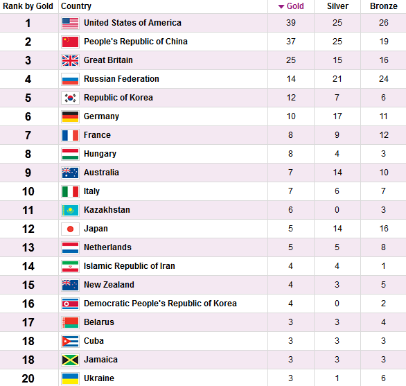 به گزارش اخبارگو ، جدول مدال های بدست آمده تا این لحظه یعنی ساعت ۲۳ روز جمعه ۲۰ مرداد در المپیک ۲۰۱۲ لندن بدین شرح می باشد.