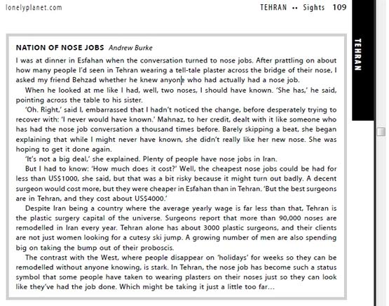 در قسمت تهران و صفحه ۱۰۹ راهنمای سفر به ایران «آندرو بورک» یکی از نویسندگان کتاب در بخشی تحت عنوان «ملت دماغ عملی» به ماجرای عمل کردن دماغ دختران و پسران ایرانی که با چسبهایی بر دماغ در خیابان ها و نقاط مختلف شهرهای کشور دیده است اشاره میکند.