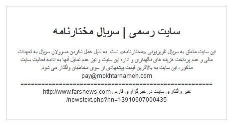 مخاطبان سریال تلویزیونی «مختارنامه» به کارگردانی داوود میرباقری با مراجعه به سایت این سریال با جمله جالبی مواجه میشوند: «این سایت متعلق به سریال تلویزیونی «مختارنامه» است. به دلیل عمل نکردن مسئولان سریال به تعهدات مالی و عدم پرداخت هزینههای نگهداری و اداره این سایت و نیز عدم تمایل آنها به ادامه فعالیت سایت مذکور، این سایت به بالاترین قیمت پیشنهادی از سوی مخاطبان واگذار میشود».