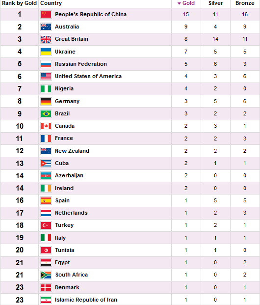 کشورمان ایران با کسب یک مدال طلا و یک برنز تا این لحظه در جایگاه ۲۳ این دوره از رقابتها می باشد.