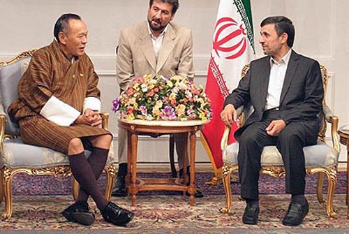 لباس متفاوت هیات بوتانی و نخست وزیر این کشور در جریان اجلاس توجه خبرنگاران را جلب کرده بود. این عکس نخست وزیر بوتان -به عنوان یکی از مقامات حاضر در نشست جنبش عدم تعهد (نم)- را در دیدار دوجانبه با محمود احمدی نژاد نشان میدهد.