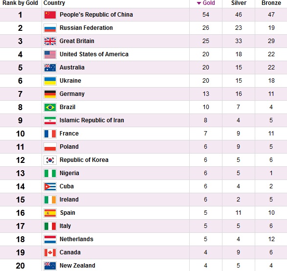 به گزارش اخبارگو ، چهاردهمین دوره مسابقات پارالمپیک که در لندن در حال برگزاری است. تا کنون یعنی ساعت ۲۳ چهارشنبه ۱۵ شهریور،چین همچنان با اقتدار در مقام نخست جدول رنکینگ مدال قرار دارد . همچنین کشورمان ایران با داشتن هشت مدال طلا و چهار نقره و پنج برنز در جایگاه بسیار مناسب ۹ این دوره از رقابتها قرار دارد.
