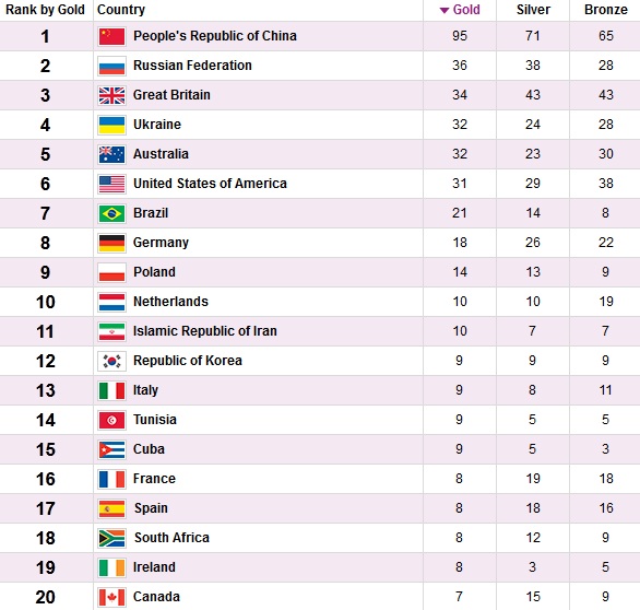 به گزارش اخبارگو ، چهاردهمین دوره مسابقات پارالمپیک که در لندن ( ۲۰۱۲ ) در حال برگزاری است. تا کنون یعنی ساعت ۲۲ روز یکشنبه ۱۹ شهریور،چین همچنان با فاصله زیاد از دیگر رقبا و با اقتدار در مقام نخست جدول رنکینگ مدال قرار دارد . همچنین کشورمان ایران با داشتن ده مدال طلا و هفت نقره و هفت برنز در جایگاه بسیار مناسب ۱۱ این دوره از رقابتها قرار دارد.