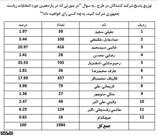 به گزارش آخرین نیوز، این پژوهش که توسط یک مرکز مطالعاتی ملی انجام شده ، نشان می دهد بیش از ۳۹ درصد شرکت کنندگان در طرح ، به سوال “آیادر یازدهمین دوره انتخابات ریاست جمهوری که در ۲۴ خرداد ۱۳۹۲ برگزار خواهد شد ، شرکت می کنید؟” پاسخ “بله” داده و حدود ۲۹ درصد هنوز تصمیم نگرفته اند.