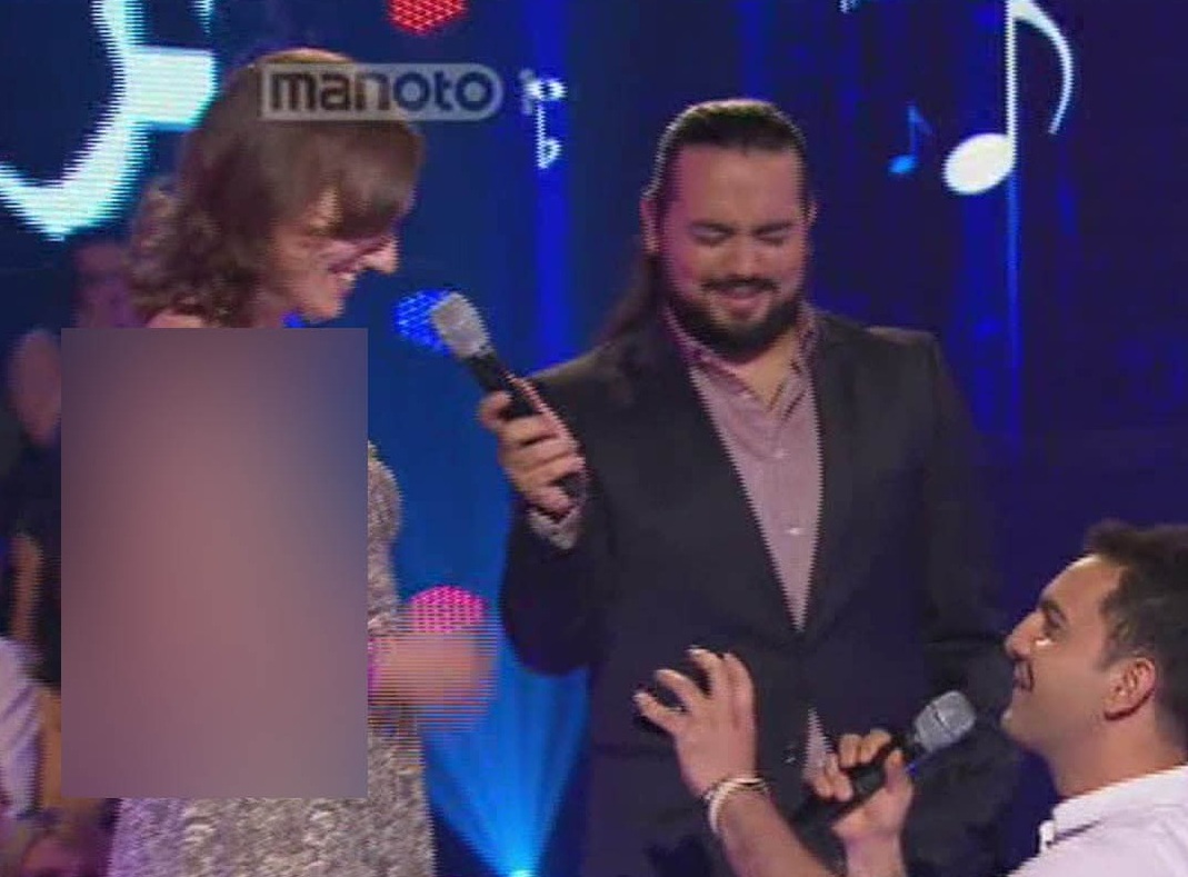 در ادامه با هماهنگی و درخواست مجری من و تو، دوست دختر فرد شرکت کننده که از قضا انگلیسی هم بود به روی صحنه رفت و کنار مجری قرار گرفت و به رسم انیمیشن های هالیوودی، پسرک ایرانی ما مقابل دختر انگلیسی زانو زده و در یک حرکت متهورانه و البته غافلگیر کننده حلقه ازدواج را تقدیم سیندرلای خود کرد. کاری که حتی باعث شد تماشاگران غافلگیر شوند.