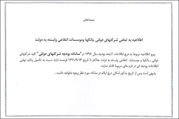 در این اطلاعیه آمده است: “پیرو اطلاعیه مربوط به درج اطلاعات لایحه بودجه سال ۹۲ کل کشور در سامانه بودجه شرکتهای دولتی، کلیه شرکتهای دولتی، بانکها و موسسات انتفاعی وابسته به دولت حداکثر تا تاریخ ۱۶ آذرماه ۹۱ فرصت دارند نسبت به تکمیل و تایید نهایی اطلاعات بودجه ای در فرمهای مربوط اقدام کنید. بدیهی است پس از تاریخ مذکور امکان درج ارقام در سامانه مورد نظر وجود نخواهد داشت.”
