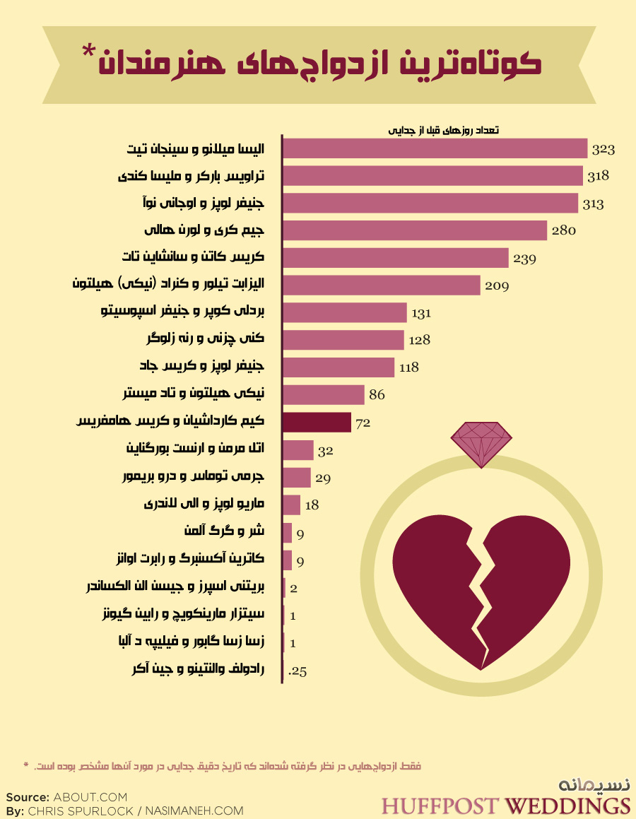 در اینفوگرافی زیر شما فهرست ۲۰ ازدواج مشهور و ناموفق هالیوودی را به همراه تعداد روزهای قبل از جدایی هر ازدواج مشاهده میکنید.