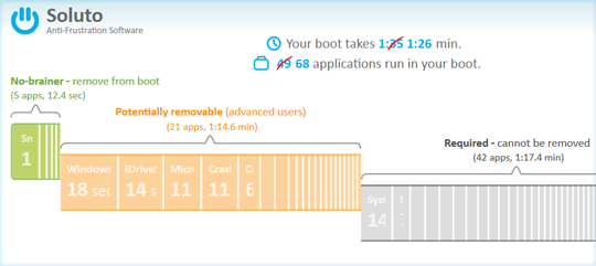 یکی از ابزارهای جالبی که در این زمینه وجود دارد برنامه تقریباً کوچکی به اسم Soluto است که با کمک آن می توانید زمان بالا آمدن ویندوزم رو از ۳:۲۶ دقیقه به ۱:۴۵ دقیقه کاهش بدهید، فقط با چند کلیک ساده و بدون درد سر!